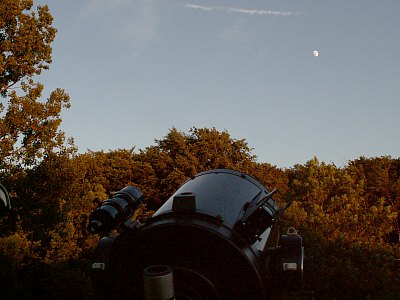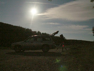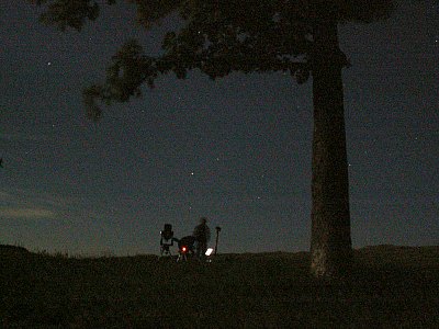 | Bericht: | Die typischen Schönwetterwolken lösen sich am Nachmittag auf und auch die doch etwas bedrohlich wirkenden Quellwolken über den Bergen fallen allmählich in sich zusammen. Ein makellos klarer Abend zeichnet sich ab; gewiß, der Mond wird stören, aber wenn die Durchsicht paßt, sollte sich ein guter Beobachtungsabend ausgehen. Auf der Sofienalpe warten zwei unangenehme Überraschungen: Erstens wird das Heu auf der Wiese eingeholt - mit mächtigen, Respekt einflößenden Maschinen. Die Bauern beenden ihre Arbeit zwar mit Sonnenuntergang, doch da habe ich schon auf dem Parkplatz aufgebaut. Zweitens: Der unangenehm kühle Nordwind. Er macht vor allem Webcamaufnahmen zum Lotteriespiel und legt sich, entgegen der Prognosen, nicht schon am frühen Abend. Dennoch wird es ein sehr schöner Beobachtungsabend; einzig schade ist, dass heute so wenige Beobachter hier sind.