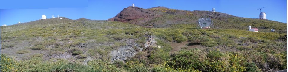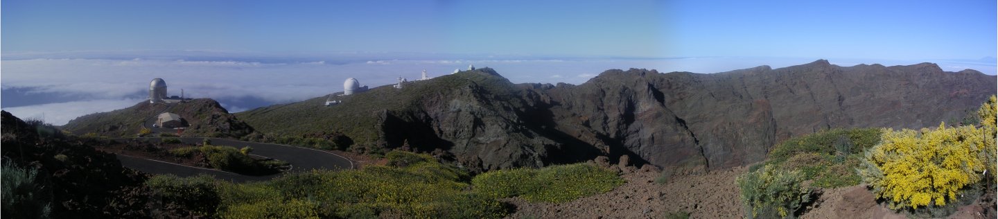 Eine Abzweigung von der Bergstraße führt durch das Areal der Sternwarten zum Gipfel. Das Sternwartenareal umringt die Nordseite des Gipfels (die Südseite existiert nicht, hier gähnt der Krater). Obwohl es auf der Spitze eine ausgezeichnete Plattform gibt wird man vom nur Spanisch sprechendem Ranger höflich wieder zur Kreuzung runter geschickt und die Schranke zum Gipfel wird um 20 Uhr gesperrt. Mann will oben keine Touristen riskieren die in der Nacht plötzlich frieren und die Autotür öffnen oder gar so töricht sind es sich plötzlich anders zu überlegen und wieder runter fahren und dabei Licht machen. Damit hatte ich insgeheim gerechnet. Von der Straße aus ist der Südhimmel eigentlich nur von einer einzigen 30 m langen Stelle aus zu sehen (auch die meisten Sternwarten haben keinen guten Südhorizont, aber dies ist ja die ENO und nicht die ESO!). Leider steht hier ein Holzgeländer das für meinen Dobson ein ziemliches Hindernis bildete. Ich bemerkte, dass nach Westen hin ein Wanderweg führte und stellte meinen Dobson hier auf. Es wurde mir dann auch klar, warum es auf der Plattform ein Geländer gibt und ich hab in der Nacht mehr als Einmal über die Folgen eines falschen Schritts nachgedacht.