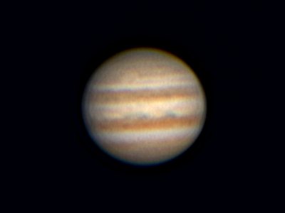 Ein kurzer Schwenk. Langes Suchen im Gesichtsfeld, da ist "es" - ein verwaschenes, extrem blasses Oval, das sich kaum vom Hintergrund des hellen Himmels abhebt. Es ist Saturn. Noch einmal. Wahrscheinlich ein allerletzter Gruß vor der Konjunktion. Bei Jupiter ist das Seeing recht passabel, leider ist auch hier wieder die "uninteressante" Seite zu sehen, aber immerhin mit schönen Wolkenstrukturen, und, wie wir gleich sehen werden, so uninteressant ist sie nicht.