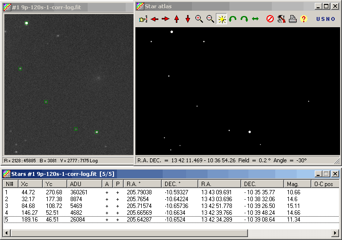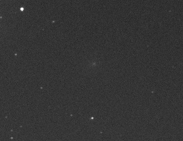 Jetzt ist es dunkel genug für 9P/Tempel 1. Ich fahre die Position genau an, und, um ehrlich zu sein, ich kann visuell nichts ausmachen. Also montiere ich die CCD-Kamera. Trotz recht lausigem Seeing mache ich eine zwei Minuten lang belichtete Aufnahme des Kometen mit f/6.3 (F=1890mm), und mir wird klar, warum ich visuell nichts ausmachen konnte.