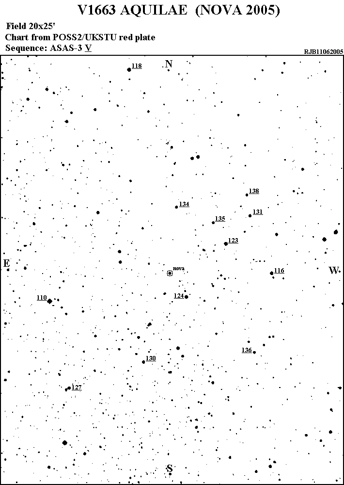 Die Nova Aquilae 2005 = V1663 Aql wird nun immer schwächer. Nach meiner ersten Beobachtung am 13.Juni 2005 mit 11,2mag konnte ich noch weitere Helligkeitsschätzungen machen: