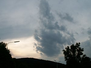 Obwohl die Wolken locker wirken, der Himmel eigentlich sogar blau, sehen wir vom Mond keine Spur. Was ist da los? Erst die eigenartige Beleuchtung verrät uns, dass im Südwesten, dort, wo der tief stehende Mond sein muss, hinter der dünnen Schicht offenbar ein mächtiger Gewitterturm stehen muss.
