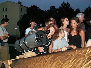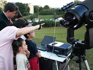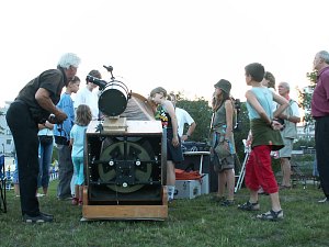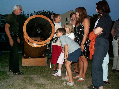Rund 50 interessierte Kinder und Eltern kommen heute Abend zu uns, nicht schlecht für diesen doch etwas entlegenen Ort und den wie gesagt sehr warmen Abend; man könnte jetzt noch baden, so warm ist es. Keine Wolke trübt den Himmel, nur etwas Dunst, das macht das Auffinden der Planeten anfangs nicht ganz einfach. Doch zunächst ist es ohnedies noch zu hell zum Sterngucken und so beginnen wir mit Erklärungen. Zuerst einmal am Fernrohr - wie funktioniert denn das?