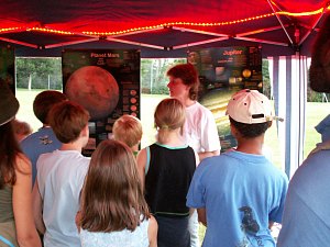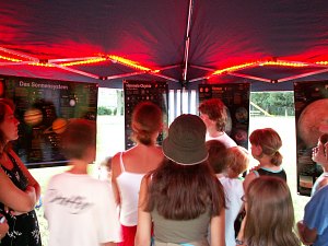 Da es noch immer sehr hell ist (leider wird es im Sommer sehr spät dunkel), informieren wir im Zelt einmal darüber, was man mit einem Fernrohr überhaupt alles sehen kann und was man erwarten darf - und vor allem, was nicht.