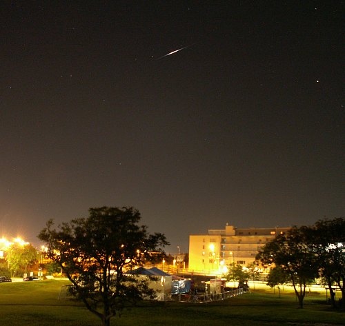 Gegen 22.15 Uhr ist es dann endlich dunkel genug, um neben den beiden Planeten - die Venus ist schon lange untergegangen und auch Jupiter verschwindet schon - und hellen Sternen auch andere Himmelsobjekte zu zeigen. Der Ringnebel in der Leier und die Kugelsternhaufen M13 und M92 begeistern alle, vor allem in dem lichtstarken 45cm-Dobson. So wundert es uns nicht, dass die letzten sternenhungrigen Gäste erst nach 23 Uhr nach Hause aufbrechen. Alle Besucher sind schon heimgegangen, als eine halbe Stunde vor Mitternacht ein Iridium-Flare für einige Sekunden allen anderen Gestirnen den Rang abläuft.