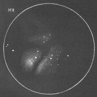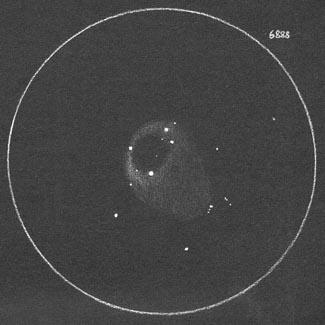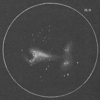| Bericht: | Fuhr zu meinem Lieblings Beobachtungsplatz auf der Gleinalm ca. 50 min. Autofahrt von Graz - es ist eine Stelle auf 1000m Seehöhe u. mit guter freier Sicht nach Süden. Zwar ist der Lichtsmog von Graz im Südosten unübersehbar aber er reicht nicht mehr besonders hoch u. der übrige Himmel ist der dunkelste den ich bis jetzt in dieser rel. unweiten Entfernung von Graz kenne. Begann um 22:00 mit der Beobachtung als die 18:00 Ra-Linie mit den Sommer Highlights der Milchstraße gerade im Meridian war. Als erstes fuhr ich per Telrad und dem 41er Panoptik Okular zu M11 dem OSTH mit der wahrlich reichen Sternpopulation (I 2 r) - blickte kurz zu R Sct dem Veränderlichen Stern mit recht großer Helligkeitsschwankungsbreite (4.5 - 8.2 mag) in dem kleinen Sterntrapez südl. von Beta Sct. Am 28.07. stellte ich 5.3 mag fest - heute checkte ich ihn nur kurz u. er war immer noch der hellste des kleinen Sterntrapez ...er fiel mir letztes Jahr auf als ich M11 das erste mal beobachtete u. dann innerhalb von einem Monat um 2.6 mag plötzlich heller war. Dann zur Sternenwolke M24 wo ich es genoß darin herumzunavigieren - ein besonders helles Gebiet erscheint fast wie ein KSTH oder zum. ein dichter offener Sternhaufen als nebeliger Fleck. im östl. Teil von M24 direkt nördl. der östl. Spitze einer kleinen Sternenraute best. aus 6 mag Sternen. Habe erst jetzt beim schreiben des Berichts nochmal mit Hilfe des Deep Sky Browsers www.messier45.com nachgesehen und es handelt sich um NGC6603 (dort mit I 2 r angegeben) nehme mal an das er sich für einen beobachtbaren OSTH in beträchtlicher Entfernung von uns befindet. Nördl. des westl. Teils dieser rautenförmigen Sternanordnung in M24 eindeutig hervorgehoben: die zwei dichten Dunkelnebel B92 u. 93. Hoppte dann weiter in Richtung M8 zu My Sgr, 1° weiter zu NGC6568 ein nicht sehr vom Sternenhintergrund abgehobener OSTH (IV 1 m) u. schließlich zu M8 den Lagunennebel wo ich dann den UHC-Filter aufschraubte u. mich endlich wieder mal ans zeichnen machte. Versuchte erst auf weißem Papier mit Bleistift zu skizzieren doch kam ich damit nicht klar - also nahm ich schwarzes Papier mit ebenfalls vorgezeichneten Gesichtsfeldkreisen u. skizzierte zuerst die Sterne hptsl. im Gebiet des Nebels u. dann die Nebelpartien teilweise nur in Umrissen aber auch schraffiert damit ich die Hell/Dunkel Unterschiede bei der Reinzeichnung daheim besser hinkriege.