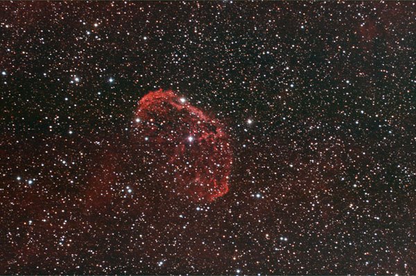 | Bericht: | Die Nacht bot wieder einmal optimale astronomische Bedingungen, und das in doppelter Hinsicht. Erstens einmal war Astrophotographie angesagt, und zweitens war waerend der langen Aufnahmeserien Unterhaltung in Form des Perseidenschauers gegeben. Schauer ist vielleicht ein bisschen uebertrieben, es waren aber einige sehr schoene Exemplare dabei - darunter auch ein Doppelmeteor, der offenbar beim Eintritt in die Atmosphaere in zwei Teile zerbrach, die dann hellleuchtend in parallelen Bahnen vergluehten. Auf Grund der guenstigen Verhaeltnisse waren auch sehr schwache Meteore zu erkennen. Ich schaetze, dass in etwa 30-40 Stueck pro Stunde sichtbar waren. Als Photoobjekt hatte ich dieses Mal den Crescent-Nebel ausgewaehlt, den ich sowohl im H-alpha Licht, als auch 'gewoehnlich' in RGB aufnehmen wollte. Bei der Bildbearbeitung wurde dann das H-alpha Bild dem Rotkanal des RGB-Bildes zugemischt. Damit laesst sich der Kontrast von leuchtenden Wasserstoffnebel deutlich erhoehen. H-alpha: 20x300sec/ISO800 ( Astronomik H-alpha Filter, 13nm) RGB: 20x 300sec/ISO800 ( IDAS-lPS - Filter)