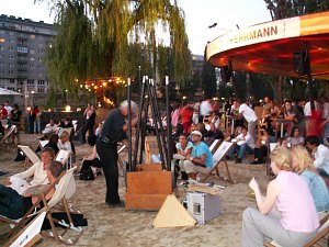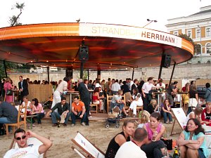 So entwickelte sich die Idee zur Space Night im "Hermann", dem trendigsten der hiesigen Lokale. Wo sich einst nur Fischer und Liebespaare ein Stelldichein gaben, erstreckt sich heute ein großer -- Sandstrand! Taucht man in die Musik ein, schließt die Augen, spürt den warmen Sand an den Füßen, dann glaubt man sich wirklich an einen ganz anderen Ort versetzt. Und doch, man ist mitten in Wien.