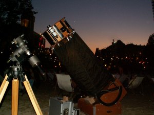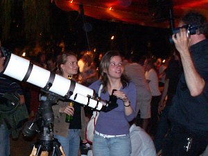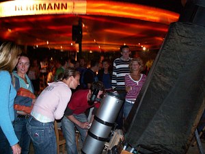 Na ja, der Himmel ist hier ziemlich lichtverschmutzt. In den kleineren Teleskopen beschränken wir uns daher auf helle Sterne wie Albireo oder Mizar ("wie bitte?", lautet oft die Gegenfrage nach der Nennung des Sternnamens; eine nette Geschichte dazu folgt noch). Natürlich müssen wir uns oft mit der Frage "Das ist alles?" oder "Geht das nicht größer?" auseinandersetzen, doch im Gespräch, was wir da eigentlich sehen, erwächst dann doch auch bei unseren Gästen das Gefühl, etwas tolles zu sehen.