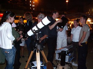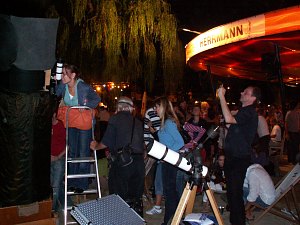 Es ist jetzt schon so dunkel, dass die hellsten Sterne den Strandgästen auffallen. Und da unsere Fernrohre natürlich viele Neugierige locken (zum Glück schauen wir nicht zum Fürchten aus), bilden sich bald lange Schlangen hinter den Teleskopen. Getuschel setzt ein, was das ganze wohl soll. Ein Aha-Erlebnis, dass hier heute eine Space Night veranstaltet wird. Erst nach und nach dämmert es den meisten, dass die Aktion mit der nahe gelegenen Urania zu tun hat. Ah ja! Und dann der Blicks durchs Fernrohr ...