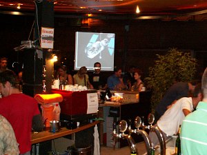 Die - für das Publikum und für uns - ungewöhnliche Situation führt auch zu einer völlig ungewöhnlichen Art, Astronomie zu vermitteln. Heiter, mit nicht ganz ernst zu nehmenden Seitenkommentaren, so dass wir uns lachend dem gemeinsamen Ziel nähern. Das Sommerdreieck gibt in solchen Situationen viel her; sei es die Überlegung, wie lange man mit dem vor der Bar geparkten Porsche zur Vega brauchen würde, oder dass die Namen der Sterne ein typisches Beispiel für "Lost in Translation" sind (treffsichere Erkenntnis einer Besucherin nach der Erklärung, dass unsere heutigen Sternnamen durch die Übersetzungskette Griechisch - Arabisch - Latein zustande kamen). Ich stelle mir Bill Murray vor, mit einem Glas japanischen Whiskey in der Hand, versuchend, "Azelfafage" zu verstehen ...