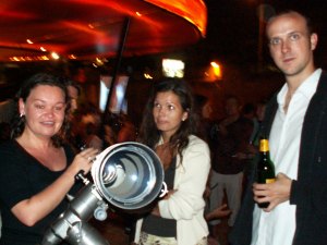 Erst recht bei den Deep Sky Objekten, die wir aus nahe liegenden Gründen nur in Rolands 18" Dobson zeigen. Lustige Gespräche ergeben sich schon um die Namen der Objekte. M13. "M was?" - "Wer ist M?" (der Chef von James Bond, oder?). Die Geschichte über die wiederholte Enttäuschung von Charles Messier, doch keinen neuen Kometen entdeckt zu haben, die dazu führte, die Nebelflecke am Himmel zu numerieren, kommt sehr gut an. Ob Messier je geahnt hätte, dass über seine Verzweiflung fast 200 Jahre nach seinem Tod in einer solchen Umgebung geschmunzelt wird? Nein; eine Strandbar zwischen Hochhäusern neben einer Sternwarte, lateinamerikanische Musik und Cocktails, davon konnte Messier nichts wissen. In welcher Runde wohl unsere kleinen Abenteuer dereinst für Heiterkeit sorgen werden?