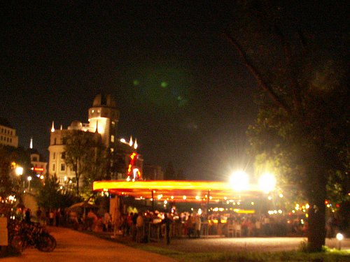 Über der hell beleuchteten Strandbar öffent sich die Kuppel der Urania und 30 Auserwählte werden zu den Sehenswürdigkeiten des heutigen klaren Abends geführt. Indes geht das muntere Treiben unten am Strand weiter. Noch einmal erlebt der Abend einen Höhepunkt, als zu später Stunde der Rote Planet aufgeht. Beim Anblick des Mars bemerken viele, dass das Beobachten mit einem Fernrohr gelernt und geübt sein will. Dabei zeigt sich Mars heute erfreulich detailreich; Phase, eine Polkappe und einige Dunkelgebiete lassen mich kurz mein Teleskop und meine Webcam vermissen. Da wäre einiges dringewesen. Aber mein Computer spielt an der Bar DVD-Player und Teleskop und Webcam sind zu Hause. Die Freude der nächtlichen Strandbesucher entschädigt für das nicht gemachte Foto.