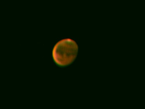 Drei Objekte aus dem Sonnensystem stehen auch noch auf der Liste, nämlich Uranus, Neptun und -- Ceres! Na ja, umwerfend sind sie alle nicht. Doch dann kommt Mars. Schon die ersten Blicke durch die flach zum Horizont zeigenden Teleskope stimmen merkwürdig: Kann es sein, dass man auf einem so tief stehenden Objekt so viele Details erkennen kann? Das einzige, was wirklich stört, ist das sekundäre Spektrum, doch von Seeing ist nicht allzu viel zu bemerken. Bei nur 8° hohem Mars montiere ich die Webcam, das Bild auf dem Schirm ist vielversprechend. Zunächst mit 3m Brennweite, das gibt nämlich einen hoch interessanten Vergleich mit der zuvor aufgenommenen Venus: