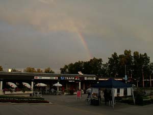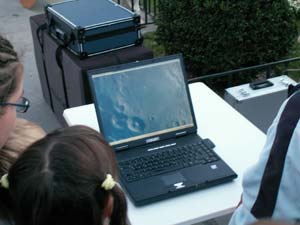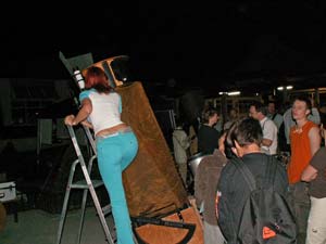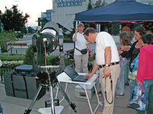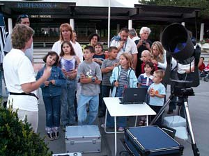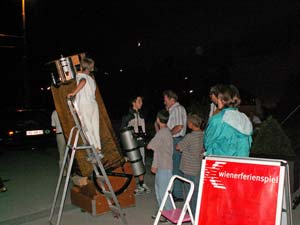 Schon eineinhalb Stunden vor dem offiziellen Beginn wird unser Infozelt vor dem Eingang des Bades in Oberlaa aufgestellt. Eine Gewitterwolke über uns verheißt nichts Gutes und eine Schauerlinie im Westen ist deutlich sichtbar. Das bereits aufgebaute computergesteuerte Vereinsteleskop wird deshalb unter das Zelt verfrachtet. Der 18" Dobson wartet noch im Auto. Trotzdem finden sich bereits die ersten Gäste ein und warten ungeduldig auf den Beginn. Der Bolam21 Wetterrechner kann zwar die Großwetterlage exzellent beurteilen, aber gegen eine lokale Gewitterzelle hat er keine Chance. Wir wissen aber über die Kurzlebigkeit einer so kleinen CB und sind zuversichtlich, unseren Sterneabend durchführen zu können. Tatsächlich: nach einigen dicken Regentropfen beginnt es aufzuklaren. Der 18" Dobson ist inzwischen auch aufgebaut und es kann losgehen. Venus im Computerteleskop, der Mond schält sich aus den Wolken, Mond und Jupiter im 18" Dobson. Leider machen immer wieder Wolken wilde Schwenks der Teleskope zu neuen Beobachtungsobjekten notwendig. Der Mond versteckt sich, also Vega und Arktur im Farbvergleich. Ein Perseidenmeteor huscht durch das Sternbild Leier. Albireo und epsilon Lyre, was halt in einem Wolkenloch sichtbar wird. M13 ist zeitweise auch sehr schön, erstaunlich für so einen hellen Beobachtungsplatz. Wie immer sind die Kinder begeistert.