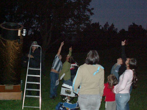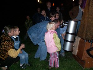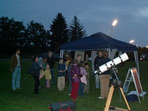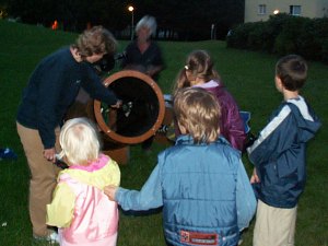 Rasch ist der 45cm-Dobson auf die Vega gerichtet. Auch wenn Sterne im Fernrohr nicht größer, sondern nur heller erscheinen - wesentlich heller sogar in so einem großen Instrument - alle wollen durchschauen. Wir schauen wirklich zu den Sternen. Immer mehr und größer werden die Wolkenlöcher, bald können wir auch andere Sterne und Sternsysteme bewundern.