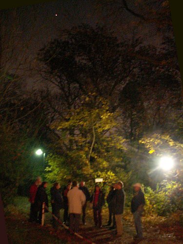 Dr. Göbel begrüßt die Gruppe im nächtlichen Sternwartenareal,