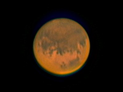 Tut das gut, die interessanteste Gegend auf dem Mars bei ruhigem Seeing zu sehen. Beeindruckend ist die große Dunstwolke über der nördlichen Polarregion (unten) und wie dunkel die Südhalbkugel ist. Eigentlich sollte der Sinus Meridiani (im Bild ganz rechts) unten und oben von einem hellen Gebiet umgeben sein. Aber was schon die Bilder des HST gezeigt haben, wird auch hier sehr schnell klar: Ein breiter Streifen der Südhalbkugel des Mars liegt offenbar unter einer Schicht aus aufgewirbeltem Staub. Vielleicht sieht man ja deshalb so wenig von der südlichen Polkappe (oben). Ich probiere eine längere Brennweite. Gefühlsmäßig geht auch das noch.