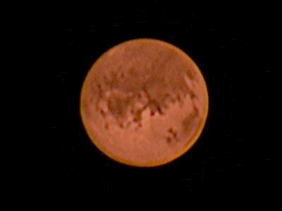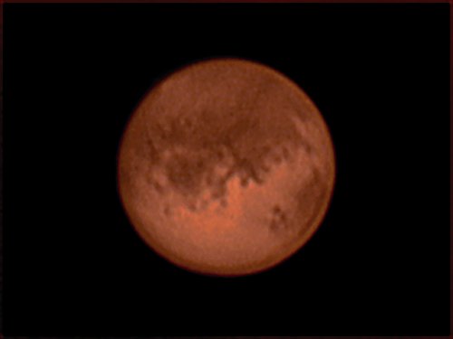 Ein paar Details kommen zusätzlich heraus, nicht allzu viele, aber der Anblick ist trotzdem wunderbar. Andreas Pfoser kommt mit zwei Freundinnen und alle sind vom Anblick des Mars angetan. Wobei der Mars auf unseren Computerbildschirmen deutlich kontrastreicher erscheint als beim Blick durchs Okular. Wie war das mit dem enttäuschenden Blick durchs Fernrohr? Aber ich muss eine Lanze muss ich für die neue Technik brechen. Schauen Sie doch bitte das obige Bild ganz genau an. Haben Sie nicht das Gefühl, dass der Mars "links unten" nicht kreisrund ist, sondern eine leichte Ausbuchtung nach außen hat? Und ist das nicht ein kleiner, weißer Fleck genau am Rand, der sich etwas über den Rand erhebt? Ein Artefakt, vielleicht. Vielleicht aber auch der Tharsisrücken mit einem der 20km hohen Vulkane - vom Bildmaßstab und auch von der Lage geht sich das haargenau aus. Fokussieren ist eine medidative Tätigkeit. Ich wende pro Aufnahmeserie gute 5 Minuten nur zum Fokussieren auf. Das Bild betrachten, Eindrücke sammeln; dann vielleicht ein kurzer Ruck mit dem Motorfokus, erneut einfach nur schauen, ob blickweise die feinsten Details herauskommen. Was man beim Aufnehmen nicht sieht, kann auch auf der Aufnahme nicht drauf sein, so einfach ist das. Irgendwann kommt dann der Schluss, dass es besser nicht geht. Aufnahme starten. Zwei Minuten Konzentration, um den Mars - seine mittlerweile nur mehr 19" scheinbarer Durchmeser passen gerade mal auf den Chip - nicht zu nahme zum Rand wandern zu lassen. Der Anblick ist herrlich. Hintereinander stehen Kurts, Martins und mein LX200, jedes mit einem Laptop. Wie in einem Großraumbüro. Es gibt (oder gab?) Puristen, die sagen, zwischen Objektiv und Okular gehört nichts dazwischen, nur das ist erlebte Astronomie. Gut, es gibt auch Ultrapuristen, die sagen, das Fernrohr stört überhaupt, nur mit freiem Auge kann man das Weltall erleben. Auch eine Ansichtssache. Aber wir fahren mit jeder Menge Technik auf, um Bilder zu erzeugen. Zerstören wir den letzten Funken Romantik oder aber handeln wir genau richtig, indem wir Bilder vermitteln, die in etwa dem entsprechen, was alle erwarten? Wir werden sehen. Roland ist eingetroffen und baut seinen Dobson auf. Von wegen Enttäuschung. Der Blick durch dieses Fernrohr ist schlicht umwerfend. Fast alles, was wir mit den Webcams einfangen, ist mit Übung und Geduld auch visuell zu erkennen. Ich ärgere mich halblaut, dass die IR-Passfilter noch immer nicht im lokalen Handel erhältlich sind. Da sagt Tahir: "Ich habe einen!". Lechz! Ich montiere das gute Stück - ein Blick mit dem Auge durch den Filter macht mich misstrauisch, denn ich sehe fast gar nichts durch den sehr dunklen Filter. Meine Webcam ist anderer Meinung: Rot, aber sehr klar und vor allem ruhig steht das Bild da. Kein Zweifel, die Kamera sieht Wellenlängen, die unsere Augen nicht mehr sehen. Ich beginne wieder bei 9m Brennweite, also der TeleVue 3x-Barlowlinse.