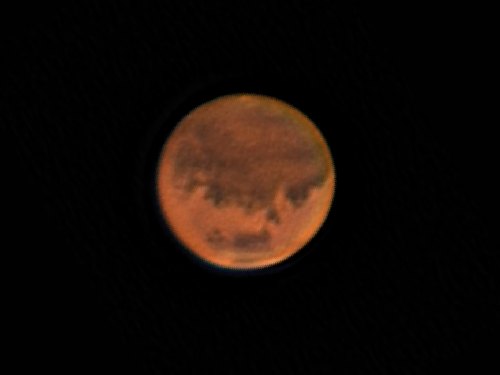 Nachdem wir am vierten Abend unseres Einführungskurses "Erlebte Astronomie, Teil 1" wieder einiges bei klarem Himmel herzeigen konnten, betätige ich mich noch ein wenig auf meiner Terrassensternwarte. Das erste Ziel ist natürlich der Mars. Böiger Wind macht das Aufnehmen schon recht schwierig. Das Seeing ist am Planeten gar nicht so schlecht, vor allem, wenn man sieht, wie die Sterne des Orion und erst recht der Sirius, funkeln. Ich nehme mit Dreifachbarlowlinse auf, also einer Brennweite von 9m. Doch erst die späteren Serien gelingen einigermassen. Was ist bloss mit dem Planeten los? Die Südhalbkugel ist so untypisch dunkel, dass der Planet sogar schwächer vom Himmel strahlt, als er es aufgrund seiner Position sollte. Kaum eine Struktur zwischen den doch reich gegliederten Gegenden am Äquator und der südlichen Polkappe, die sich ganz weit zurückgezogen hat. Erkenne ich neben der Polkappe eine Wolke oder einen Staubsturm? Auf der Nordhalbkugel ist es ebenfalls bewölkt. Über dem Mare Acidalium liegt eine hohe, cirrusartige Bewölkung. Im Fernrohr ist sie schneeweiß, auf meiner Aufnahme, die ich ohne IR-Sperrfilter gewinne, ist sie immer noch dut zu erkennen, aber eher gelblich. Das Wetter auf dem Planeten ist nicht allzu gut. Deutlich erkennt man auch, dass Mars gegenüber Ende Oktober schon zwei Bogensekunden verloren hat - das ist zwar nur ein scheinbarer Neptundurchmesser, aber andererseits sind es 10 Prozent. Ein Blick zum Mond muss auch sein. Vollmond ist vorbei (und hoffentlich auch die hysterische Massenverblödung im öffentlich-rechtlichen Rundfunk) und das Mare Crisium steht nahe dem Terminator. Gut zu erkennen schon die Kraterreihe Langrenus - Vendelinus - Petavius - Furnerius. Die Wintersternbilder sind vollständig aufgegangen und auch ein Blick zum Saturn ist schon möglich, obwohl er tief steht. Dieser Blick überrascht mich in doppelter Hinsicht. Zum einen ist das Seeing trotz geringer Höhe recht gut. Zum anderen erstaunt mich die scheinbare Größe des Planeten. Hätte mich nicht wundern sollen: Meine Magellan-Steuerung nennt sowohl bei Mars als auch bei Saturn 18" als scheinbaren Durchmesser, nur dass Saturn noch einen Ring hat. In letzter Zeit nur mit Mars beschäftigt, habe ich mich an das kleine Objekt und starke Vergrößerungen gewöhnt. Ich beschliesse, zum Vergleich, und obwohl die Bedingungen nicht soooo gut sind, Saturn mit der gleichen Konfiguration aufzunehmen wie Mars. Was für ein Erlebnis und ich erinnere mich, Saturn noch selten mit der 3x-Barlowlinse aufgenommen zu haben. Er passt ja gerade einmal auf den Chip. Gut, man erkennt, wie sich die Lage der Saturnringe heuer verändert hat. Man erkennt sogar die Cassini-Teilung. Aber darauf will ich gar nicht hinaus. Sondern: Wir sind doch beim Saturn froh, wenn wir die Cassini-Teilung gut ins Bild bekommen, die spärlichen aber durchaus vorhandenen Details in den Wolken "jagen" wir kaum. Aber was für kleine Details versuchen wir auf dem Mars zu erkennen! Es ist schon erstaunlich. Man muss die Planeten einfach vergleichen, auch das ist sehr lehrreich. Langsam zeichnet sich ein Ende der Marssaison ab. Noch ein paar Wochen, dann wird Mars so klein geworden sein, dass sich Aufnahmen nicht mehr lohnen. Gut, dass dann Saturn schon hoch stehen wird, so können wir uns neuen Abenteuern zuwenden. Und wenn Saturn langweilig wird, wird Jupiter schon zu angenehmen Zeiten beobachtbar sein. So geht's am Himmel, ob wir hinschauen oder nicht. Der Abend hat jedenfalls gezeigt, dass sich das Hinschauen allemal lohnt. |