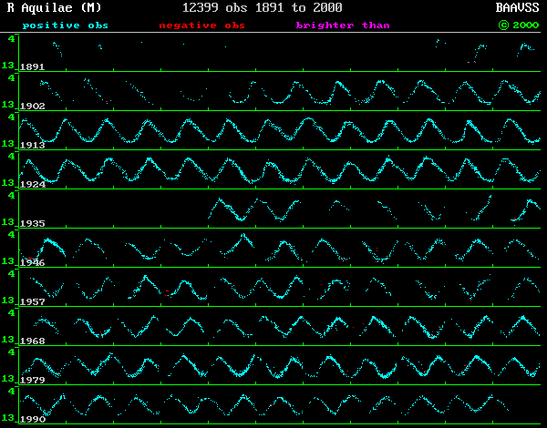 R Aquilae ist ein heller Mirastern im Adler am Ort 19h06,4m +8°14' (2000.0). Er ist relativ leicht zu finden: knapp 6 Grad südlich des hellen Sterns Zeta (ζ) Aql lässt sich R Aql mit genauen Karten (siehe unten) aus dem Sterngewimmel der Milchstrasse heraussuchen. Die Helligkeit des Sterns schwankt etwa zwischen 7. und 11.Grösse mit einer Periode von etwa 9 1/2 Monaten, allerdings wurde der Stern schon 5,5mag hell und 12,0mag schwach beobachtet. Der Stern ist in seinem gesamten Lichtwechsel gut mit Fernglas und kleinem Fernrohr beobachtbar. R Aql ist einer derjenigen Mirasterne die schon seit mehr als 100 Jahren von Amateurastronomen visuell beobachtet werden. Aus den erhaltenen Lichtkurven und Maximumsterminen wurde eine ständige Verkürzung der Periode des Lichtwechsels von fast einem Jahr auf derzeit etwa 9 Monate festgestellt. Unten habe ich einige Artikel dazu zusammengestellt. Der Artikel von Templeton, Mattei und Willson zeigt auch sehr schön den Wert visueller Helligkeitsbeobachtungen: neben der mehr als 90 Jahre umfassenden Aufzeichnung des Lichtwechsels sind die Mittelwerte der visuellen Beobachtungen in der Genauigkeit durchaus mit den CCD Messungen vergleichbar. R Aquilae ist wie alle Mirasterne auch ein sehr roter Stern: im Fernrohr ist seine Farbe durchaus wahrnehmbar und ein schöner Anblick. Der Stern erscheint als gelbroter Funken unter vielen weissen Sternen im Feld. Am Abend des 28.Nov. beobachtete ich um 18h00 R Aql: ich benutzte meinen 130mm Refraktor bei 35x und schätzte die Helligkeit auf 7,4mag: etwas schwächer als der Vergleichsstern 72 (7,2mag) auf der Karte und nur sehr wenig heller als der Vergleichsstern 75 (7,5mag). Der Stern ist also nahe seinem Maximum und derzeit sehr gut zu sehen. Wer versucht Helligkeitsschätzungen des Sterns zu machen? Leseliste, Lichtkurven und Karten zu R Aql: Karten von R Aql vom Kartenserver der AAVSO: Fernglas-Karte, Übersichtskarte, Detailkarte. Lichtkurve von R Aql in den letzten 1000 Tagen, erstellt mit dem Light-Curve Generator der AAVSO: Lichtkurve anzeigen Kurze Beschreibung von R Aql bei der BAV: http://www.bav-astro.de/sterne/aqlr.html Fachartikel zur Periodenänderung von Mirasternen: Albert A. Zijlstra, Timothy R. Bedding: Period Evolution in Mira Variables: http://www.aavso.org/publications/ejaavso/v31n1/2.pdf |