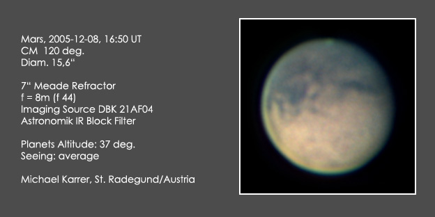 | Bericht: | nach wochenlanger pause endlich wieder eine halbwegs brauchbare planetenluft. der marsdurchmesser ist schon stark geschrumpft, details darzustellen wird wieder herausfordernd. deutlich ist solis lacus, über dem mare sirenum befinden sich ausgedehnte, dünne wolken. olympus mons ist visuell erkennbar. durch die bildbearbeitung wird er zu einer leicht rötlichen zone.