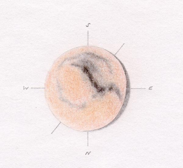 | Instrument: | Maksutov-Newton 127/762 mm, 4-mm-Okular (190,5x), Orangefilter 23A, Farbwiedergabe ohne Filter | ||||||||