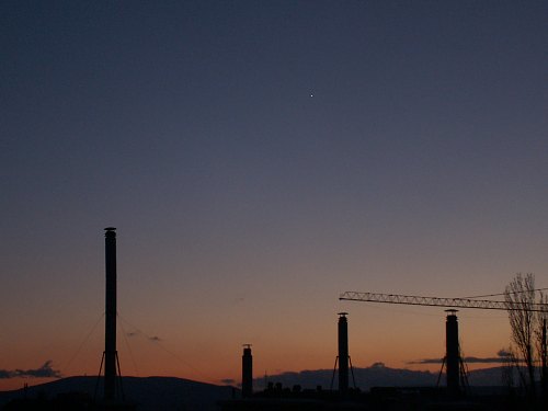 Die Abendsichtbarkeit der Venus dauert nicht mehr lange, am 14. Jänner wird sie in unterer Konjunktion stehen (übrigens die erste untere Konjunktion nach dem Venustransit am 8. Juni 2004; 584 Tage beträgt die mittlere synodische Umlaufzeit der Venus). Da die untere Konjunktion in südlich der Sonne stattfinden wird, werden wir die Venus nur bis ca. 6. Jänner am Abendhimmel sehen können. Derzeit ist die Venus in den frühen Stunden der Dunkelheit - also am späteren Nachmittag, bedingt durch die Jahreszeit - aber noch sehr beeindruckend, sowohl mit freiem Auge als auch mit dem Fernrohr. Im Fernrohr zeigt die Venus eine sehr dünne Phase und einen beachtlichen scheinbaren Durchmesser. Mit 43" ist sie in etwa so groß wie Jupiter in einer durchschnittlichen Opposition, und sie wird noch größer. Obige Aufnahme entstand um 14.30 Uhr, also noch bei Tag, um eine größere Höhe auszunützen. Mit einem IR Passfilter kann man helle Planeten durchaus gut auch bei Tag aufnehmen. Der helle Himmelshintergrund ist im nahen IR viel, viel dünkler als im sichtbaren Teil des Spektrums. |