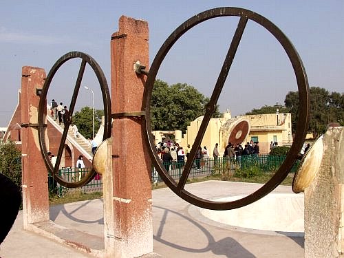 Kranti Writa: Auf einem gemauerten Sockel befinden sich 2 Kreise aus Messing, von denen sich einer in die Ebene des Äquators und der andere in die Ebene der Ekliptik drehen lassen. Es dient sehr einfach zur direkten Messung der Längen- und Breitengrade eines Sterns. Es kann zu jeder Tages- und Nachtzeit benutzt werden.