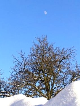 Hier herrschte pures Sibirien samt Schneetreiben, also schnell die Schaufel gezückt und die Wege freigebuddelt. Wie war das doch gleich, wegen Erholung und so? Na gut, ein wenig körperliche Ertüchtigung konnte ja nicht schaden. Am nächsten Nachmittag zeigte sich der Mond hinter dem Wald schüchtern durch eine dünne Wolkendecke.