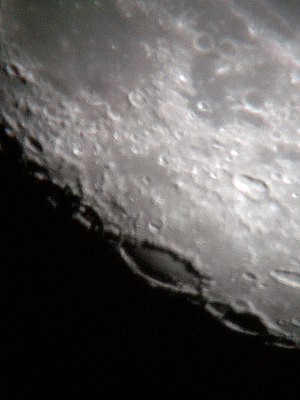 Im letzten Bild erkennt man eine sehr auffällige Albedostruktur, die an einen Katzenkopf oder eine Gabel erinnert. Sie hat keinen Namen und ist auf keiner Mondkarte als solche eingezeichnet. Komisch, dabei ist sie bei Vollmond eine der auffälligsten Strukturen überhaupt. Auch ziemlich voll beleuchtet kann der Mond sehr spannend sein. |