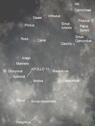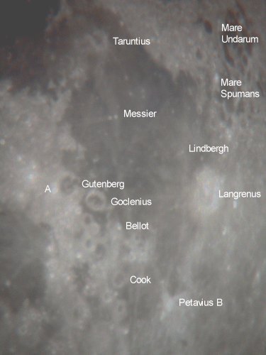 Ermuntert durch diese kontrastreichen Ansichten nehme ich mir drei Regionen auf dem Mond vor, die aus diesem Blickwinkel selten beobachtet werden: Die großen Mare Fecundidatis und Tranquillitatis sowie eine Region südlich des Mare Imbrium. Sie zeigen sehr deutlich, dass die bekannten große Krater, die nur durch ihren Schattenwurf wirken, praktisch nicht erkennbar sind, während es vor allem kleine, helle Strukturen (meist kleine Krater) oder eben die großen, dunklen Lavabecken sind, die den Anblick dominieren. Die kleinen Krater sind jung und der helle Regolithboden reflektiert das Sonnenlicht ähnlich wie ein reflektierendes Nummernschild; daher sind sie um Vollmond so gut zu erkennen. Sie eignen sich auch sehr gut, während einer Mondfinsternis Kontaktzeiten mit dem Kernschatten zu messen. Meist haben diese kleinen Formationen keinen Namen, sondern nur die "Sekundärbezeichnung" A, B, C, usw., in einer Region. Zu den drei Aufnahmen gibt es jeweils eine Legende mit den wichtigsten Formationen. Mit einem guten Mondatlas kann man noch viel mehr identifizieren.