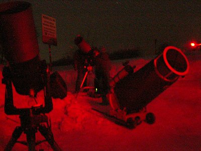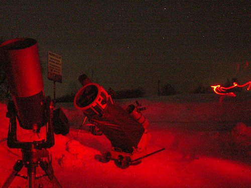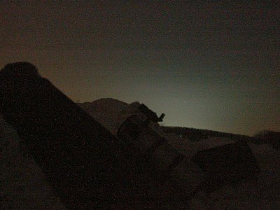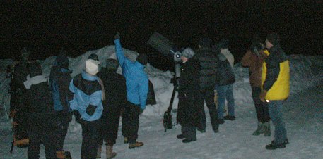 Vier Teleskope, aber wesentlich mehr Beobachter sind heute auf die verschneite Sofienalpe gekommen. Die -8°C Außentemperatur werden nicht als solche empfunden, denn es ist windstill. Einheitlich empfinden alle die Bedingungen als "angenehm". Na also, man kann sich also auch an Kälte gewöhnen.