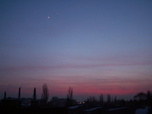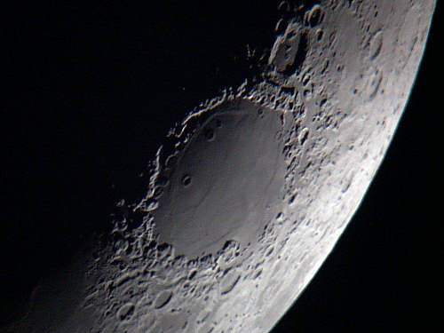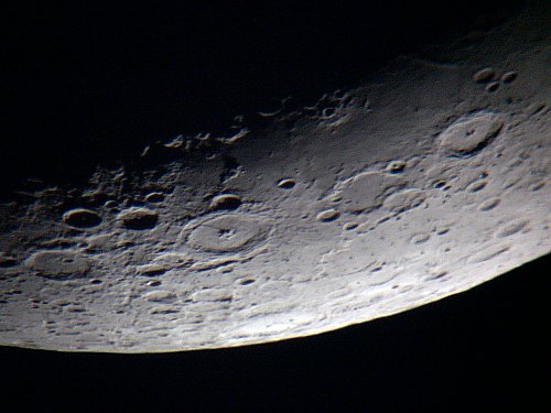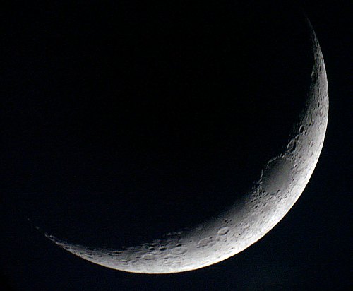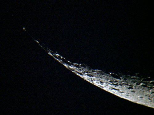 Eine kitschig verfärbte Abenddämmerung mit dünner zunehmender Mondsichel, was will man mehr. Als Draufgabe noch gutes Seeing, so entstehen ein paar schöne Blicke auf den Mond in einer selten so gut zu beobachtenden Phase. Immer wieder ist es erstaunlich, wie klein der Mond mit einer normalen Fotooptik ist. Jetzt ein paar Aufnahmen durchs 12" LX200 mit einem 75mm Projektionsokular. Das gute Seeing erlaubt, ein paar Ausschnitte heranzuzommen. Fazit: Ein paar schöne Mondblicke sind auch nicht zu verachten. |