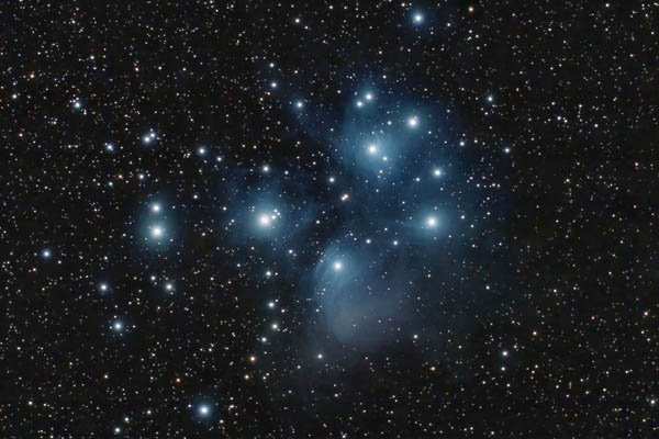 | Bericht: | Zehn klare Naechte um Neumond sind schon Geschenk der Natur, allerdings war auch ein Haken dabei - die Temperaturen lagen so zwischen -8C bis -12C. Gluecklicherweise liegt Kaltenleutgeben auf etwa 400m, und waehrend Wien speziell am Ende der Schoenwetterperiode im Nebel versank, blieb hier der Himmel klar, wenn auch fallweise etwas dunstig. Insgesamt gelang es mir sieben Objekte abzulichten. IC1805 habe ich hier ja schon vorgestellt, drei andere sollen hier nun folgen: Zuerst einmal unsere Klubsignatur, die Plejaden ( M45)