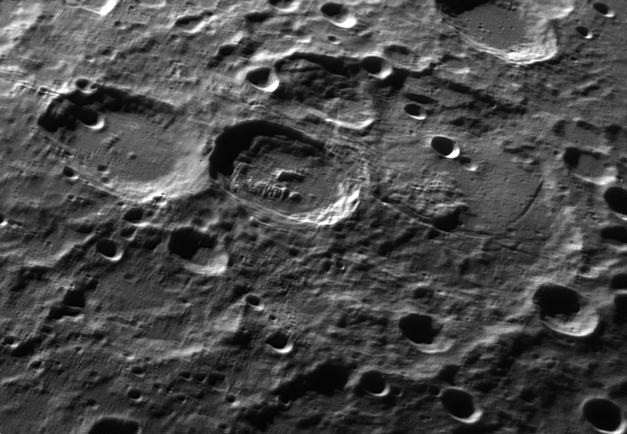 | Bericht: | vor unserem monatlichen astrotreffen bei fritz sussmann hetze ich zur sternwarte, da ein blick durch den refraktor eine gute luftruhe verspricht. tatsächlich, auch in der grossen optik ist die luft noch akzeptabel ruhig. mit der webcam von imaging source sind 20 GB kraterlanschaft schnell am speicherlimit des notebooks. eine der ersten ausarbeitungen zeigen die große, alte kraterebene janssen - eine detailreiche region mit rillen und dem jüngeren kratern fabricus.