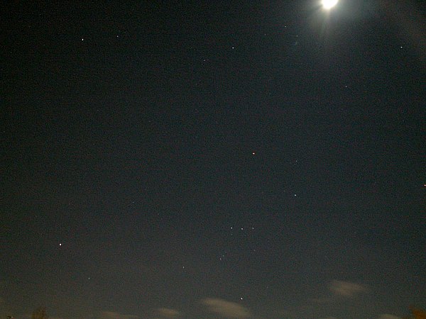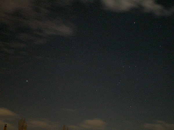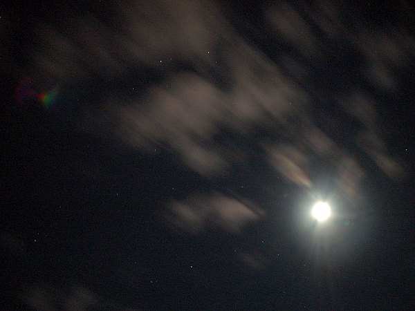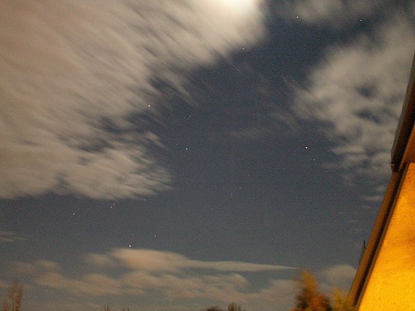 Nach Durchzug einer kräftigen Störung mit jeder Menge Regen klart die vom Mond aufgehellte Nacht auf. Die rasch über die Sternbilder ziehenden Wolken sind ein reizvolles Fotomotiv.