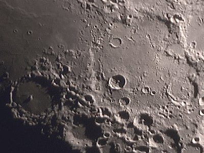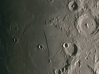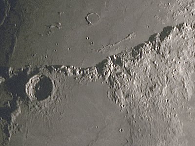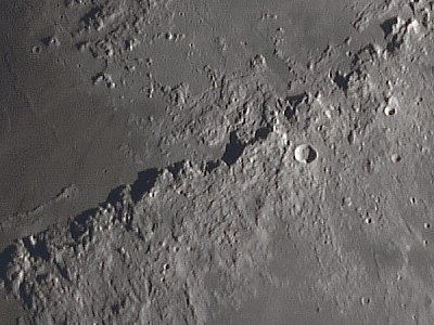 Auffällig ist die starke Libration sowohl in Länge als auch in Breite, die randnahe Meere wie das Mare Australe, Mare Marginis und Mare Smythii sehr deutlich erscheinen läßt (siehe auch Wolfgang Vollmanns Bericht von gestern). Ich wende mich aber mit der Webcam dem Terminator zu. Alle folgenden Aufnahmen mit F=3000mm, ca. 40 - 70 von 300 Frames mit IR Passfilter, auf 70% verkleinert.