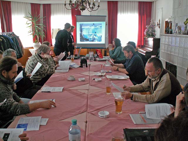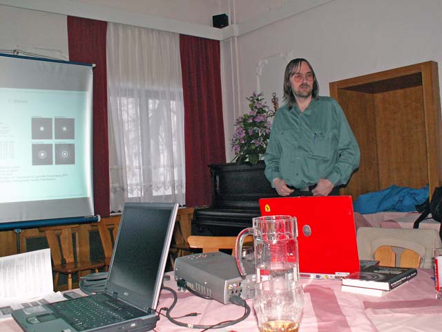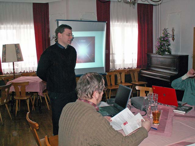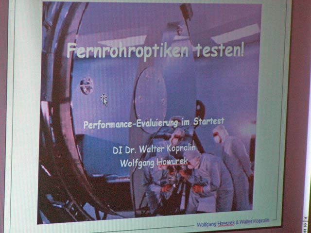DI Dr. Walter Koprolin und Wolfgang "Howdi" Howurek erklärten einen Nachmittag lang, wie man auf ale möglichen Fehler einer Fernrohroptik draufkommen kann. Da die Praxis wegen Bewölkung und heftigen Windböen ausfallen musste, konnten die Teilnehmer am Schluss bei einem kleinen Quiz erste eigene Diagnoseversuche unternehmen.