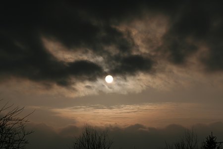 Durchs Fernrohr können wir nur in die Landschaft gucken. Die Wolken reissen viel zu spät auf und es ist auch unangenehm kalt. Na dann, bis zum nächsten Mal. Am 29. April wird es ja hoffentlich nicht mehr so winterlich sein ...
