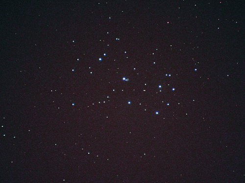 | Bericht: | Es ist sehr klar; ich habe kein konkretes Programm heute Abend, sondern probiere ein wenig herum und konzentriere mich vor allem auf den Saturn. Zunächst ein paar Tests mit der Canon EOS 350D; bei 800 ISO ist die Kamera schon so empfindlich, dass die Lichtverschmutzung gnadenlos zuschlägt. Mehr als 10 Sekunden Belichtungszeit sind nicht drin, obwohl die Durchsicht heute auch für Wiener Verhältnisse gar nicht schlecht ist. Eine nette Aufnahme der Pleiaden ist das einzige, was halbwegs präsentabel bleibt. Dunkler Himmel ist gefragt!