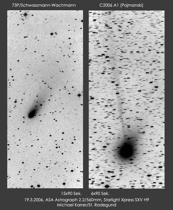| Bericht: | Dank der enormen Lichtstärke des Astrographen (eine Leihgabe von Astro Systeme Austria) konnte ich die beiden Kometen schon mit kurzen Belichtungszeiten aufnehmen. Komet Pojmanski wird schwächer, der Plasmaschweif ist schon viel zarter, dafür ist der kurze Staubschweif etwas deutlicher zu erkennen. Hingegen wird Komet Schwassmann-Wachmann stetig heller und könnte im Mai freisichtig werden!