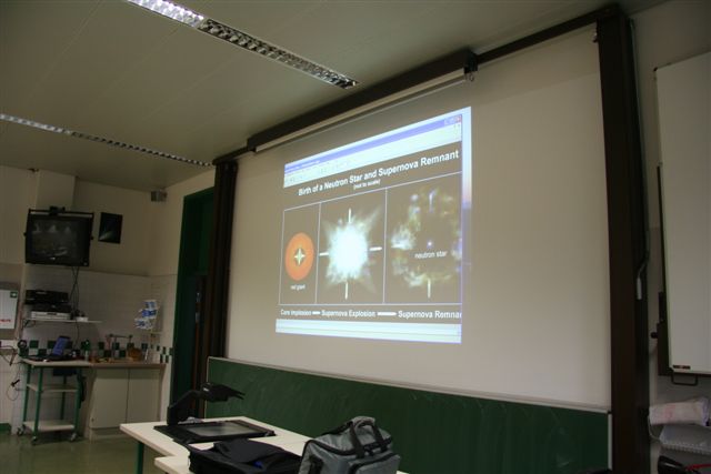 Mit Hilfe von Grafiken, Aufnahmen von Weltraumteleskopen und ein paar Formeln wurden die Welt der exotischen Himmeslobjekte in den Physiksaal gebracht. Besonders erstaunt waren die Schüler, als sie hörten, dass in vielen Bereichen der Naturwissenschaften die derzeit gültigen Theorien jederzeit widerlegt werden könnten. Wir haben noch lange nicht "alles" erforscht! Gerade das macht Wissenschaft so spannend.