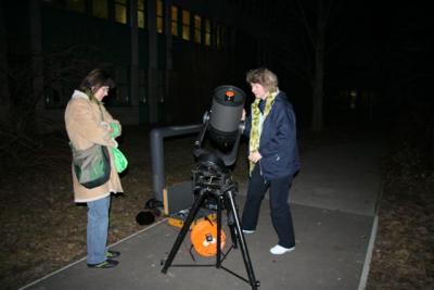 Nach einem virtuellen Blick im Computerplanetarium auf die kommende Sonnenfinsternis wagten wir den echten Blick zum Himmel. Und siehe da - es war zwar leicht bewölkt, aber Saturn war zu sehen. Daher konnten wir nach der Theorie der Schwarzen Löcher auch noch ein paar leichter fassbare Himmelsobjekte bewundern. Erst nach einiger Zeit wurde mir klar, dass die Durchsicht an diesem Abend zwar recht bescheiden, aber das Seeing ausgezeichnet war. Saturn war im 10,5 mm Plössl im C8 bemerkenswert. Sogar Mars war noch als winziges Scheibchen zu sehen. Beiden Planeten absolut ruhig und gestochen scharf!