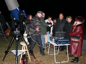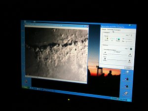 In der modernen Astronomie schaut niemand mehr selbst durchs Fernrohr; Detektoren wie Kameras leiten das Bild in Computer weiter und die Computer steuern auch das Teleskop - so wie in unserer Amateuranordnung. So können alle die Schönheit der Mondlandschaft gemeinsam bestaunen und, nach etwas Einstellungsakrobatik, auch die Sternbedeckung verfolgen.