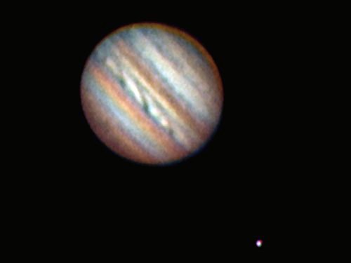 (naja, das ging schon einmal schärfer) und dann, später, Jupiter. Hier muss ich auf die IRGB Komposit Technik zurück greifen. Eine Aufnahme mit IR Passfilter und dann rasch eine zweite mit IR Sperrfilter sollte ein Komposit ergeben.