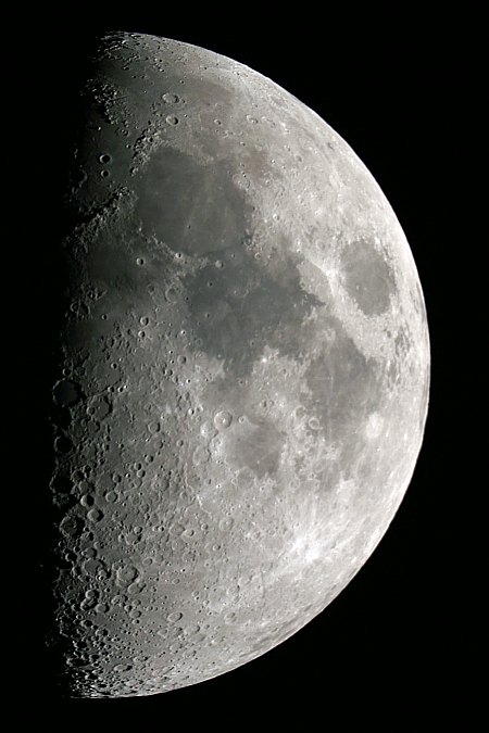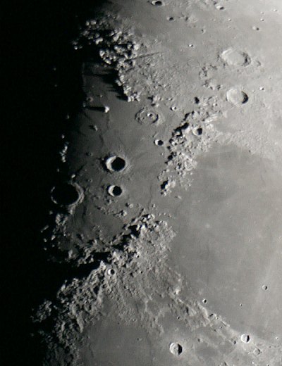 | Bericht: | Der Abend ist sehr dunstig, aber der Mond steht, wie es sich für die Jahreszeit gehört, nahe dem Ersten Viertel hoch am Himmel; eine tolle Phase. Für mich eine gute Gelegenheit, die Canon EOS 350D erstmals direkt am Fernrohr auszuprobieren (den nötigen Adapter habe ich jüngst erstanden). Herausforderung ist das Fokussieren, der Rest ist aber einfach. Sogar mit Belichtungsautomatik kommen brauchbare Bilder heraus, besser geht es aber schon mit manueller Einstellung. Klar, mit F=3m (f/10) bekomme ich den Mond nicht mehr auf den Chip (das geht ja nicht einmal beim Kleinbildfilm). Für Ausschnitte aber eine tolle Brennweite.
