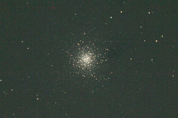 Ich experimentiere und mache am 12" LX200 ein paar Aufnahmen von M13 mit zwei f/6.3 Reducern, das gibt f/3.3. Bei dem großen Chip der EOS 350D sind in dieser Konfiguration die Sterne am Rand leider schon deutlich verzerrt, doch in der Mitte passt alles und schon mit nur 10 Sekunden Belichtungszeit bei 800 ISO ist viel auf der Aufnahme zu erkennen. Ich stacke drei Aufnahmen. Damit kann ich das helle Hintergrundlicht fast wegbekommen.