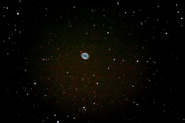Es ist für Wiener Verhältnisse sehr klar und ich widme mich daher einem weiteren Deep Sky Objekt mit der Canon EOS 350D: Dem Ringnebel M57. Erste Aufnahmen mit 15s bei 800 ISO zeigen, dass etwas mehr nicht schlecht wäre. Ich entscheide mich dann, trotz des höheren Rauschens, für 20 Sekunden bei 1600 ISO. Aus 5 Aufnahmen bei f/6.3 entsteht dieses Bild.