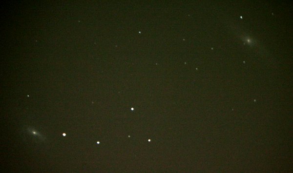 Gar nicht so übel. Es hätten ja mehr Aufnahmen werden sollen, aber der Rest war eine Ansammlung chaotischer kurzer Strichspuren. Ich verbessere das Alignment etwas (anstelle zweier Sterne nehme ich nur einen, offenbar fehlt es an Motivation), leider nicht gut genug. Mein nächster Versuch gilt schwierigen Objekten, M65 und M66 im Löwen. Aus der Stadt?! Mal sehen. Ich gehe mit 1600 ISO ans Werk und "dank" meines lausigen Alignments maximal 20 Sekunden Belichtungszeit. Etwas mehr Bilder sind auswertbar, mit folgendem Ergebnis.